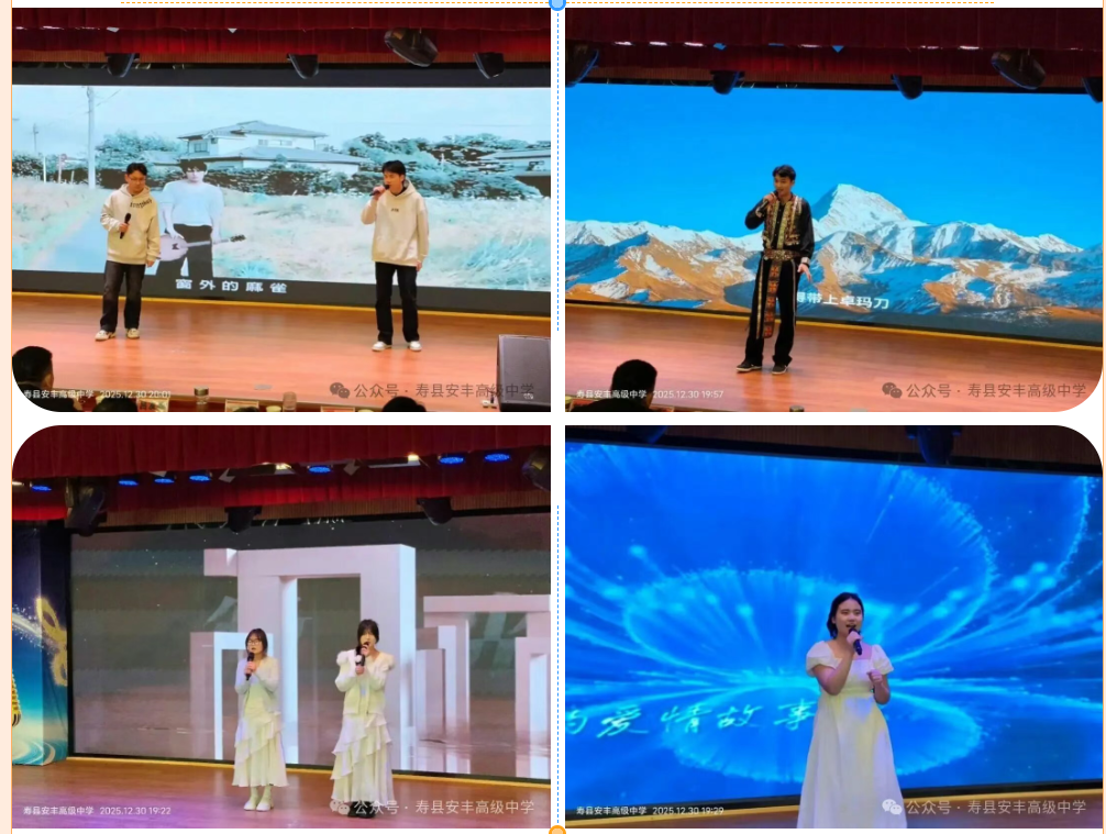 2025年12月30日晚,岁末迎新之际,安丰高中校园文化艺术节在欢声笑语与艺术共鸣中拉开帷幕。本届艺术节以“科技启智,艺术润心”为主题,融合科技元素与艺术展演,充分展现了我校学子多元发展的精神风貌。作为艺术节重头戏的“校园十佳歌手”比赛,经过激烈角逐,在校学生活动中心圆满落下帷幕。学校党总支副书记常洋、政教主任袁同龙出席活动,并为获奖选手颁奖。