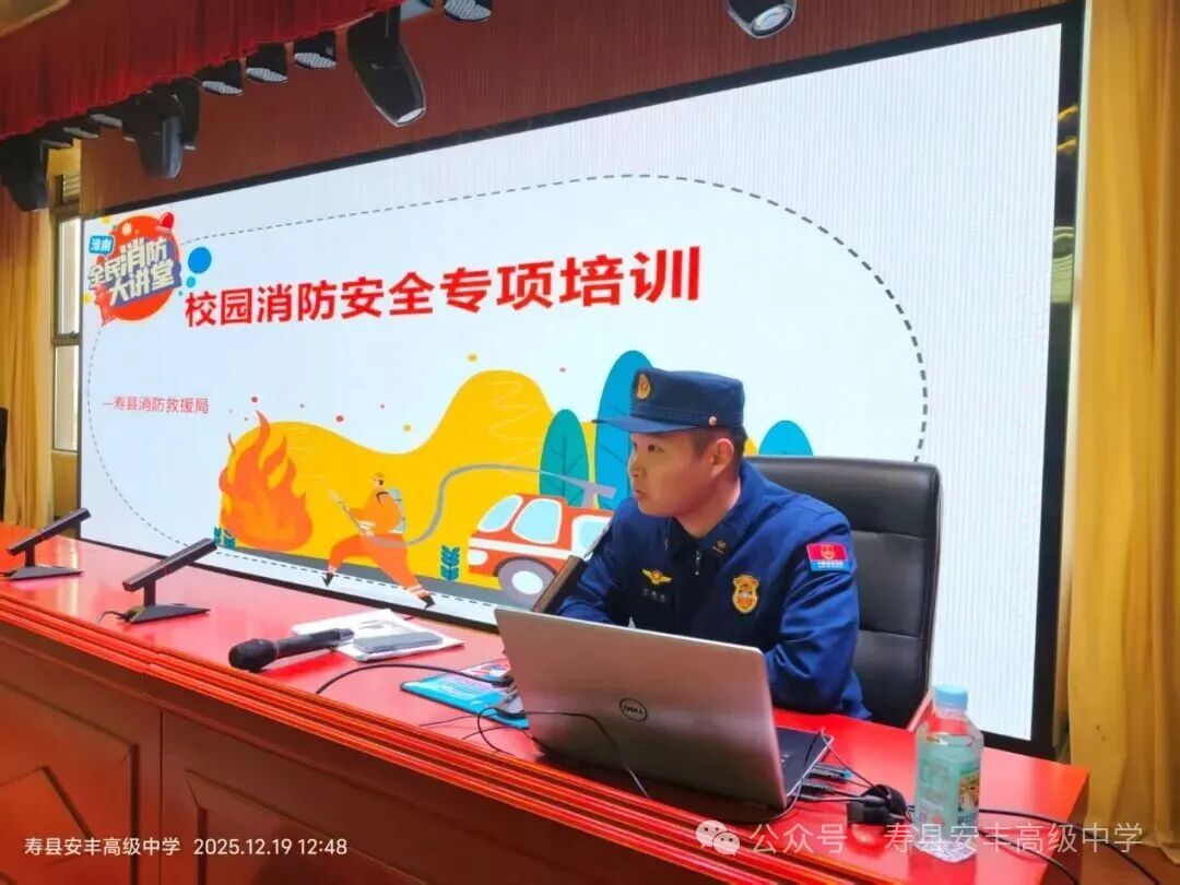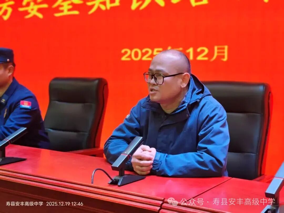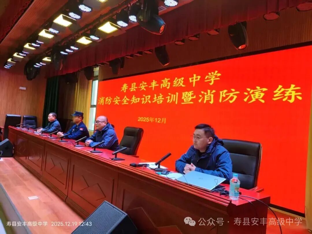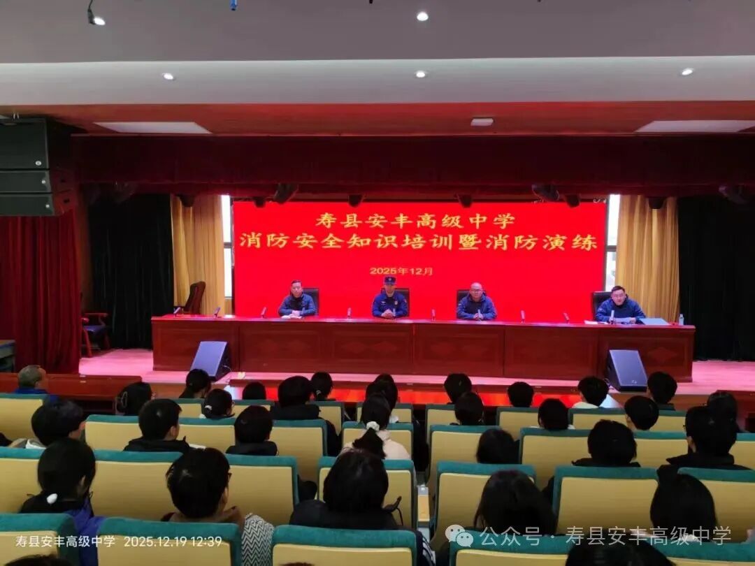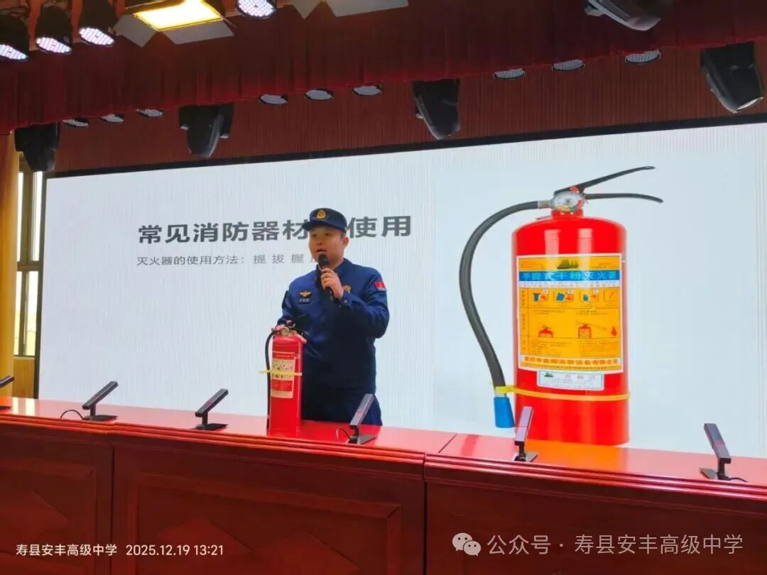 为筑牢校园消防安全防线,切实提升师生及后勤人员的消防安全意识与应急处置能力,12月19日下午,安丰高中在学生活动中心三楼会议室举行消防安全知识培训暨消防演练大会。