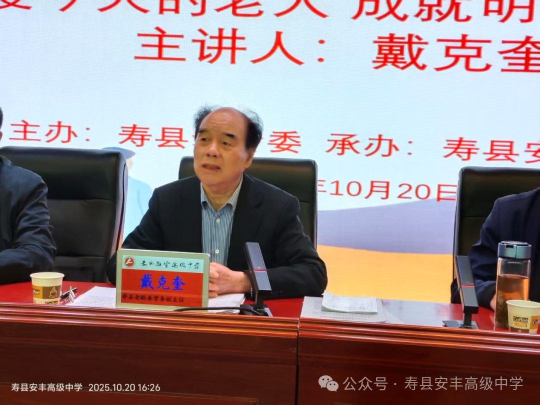 整场活动的核心环节,是由县老龄委常务副主任、安丰高中杰出校友戴克奎所作的主题报告。他以“关爱今天的老人,成就明天的自己”为题,为学弟学妹带来一场深情而深刻的分享。作为老学长,他的话语亲切而富有感染力。戴克奎结合自身阅历,从青春校园回忆到敬老美德的当代意义,从老龄工作现状到对青年学子的殷切寄语,系统阐述了我国人口老龄化国情,深刻解读了孝亲敬老传统美德的时代价值。他勉励青年学子要常怀感恩之心,从尊重身边长辈做起,将“小孝”持家升华为“大孝”奉献社会的情怀。整场报告不仅是一次国情教育,更是一次生命教育的启迪,让同学们对“老龄化”有了更直观的理解,对“敬老”有了更深刻的体认。